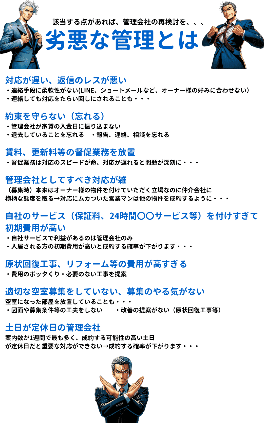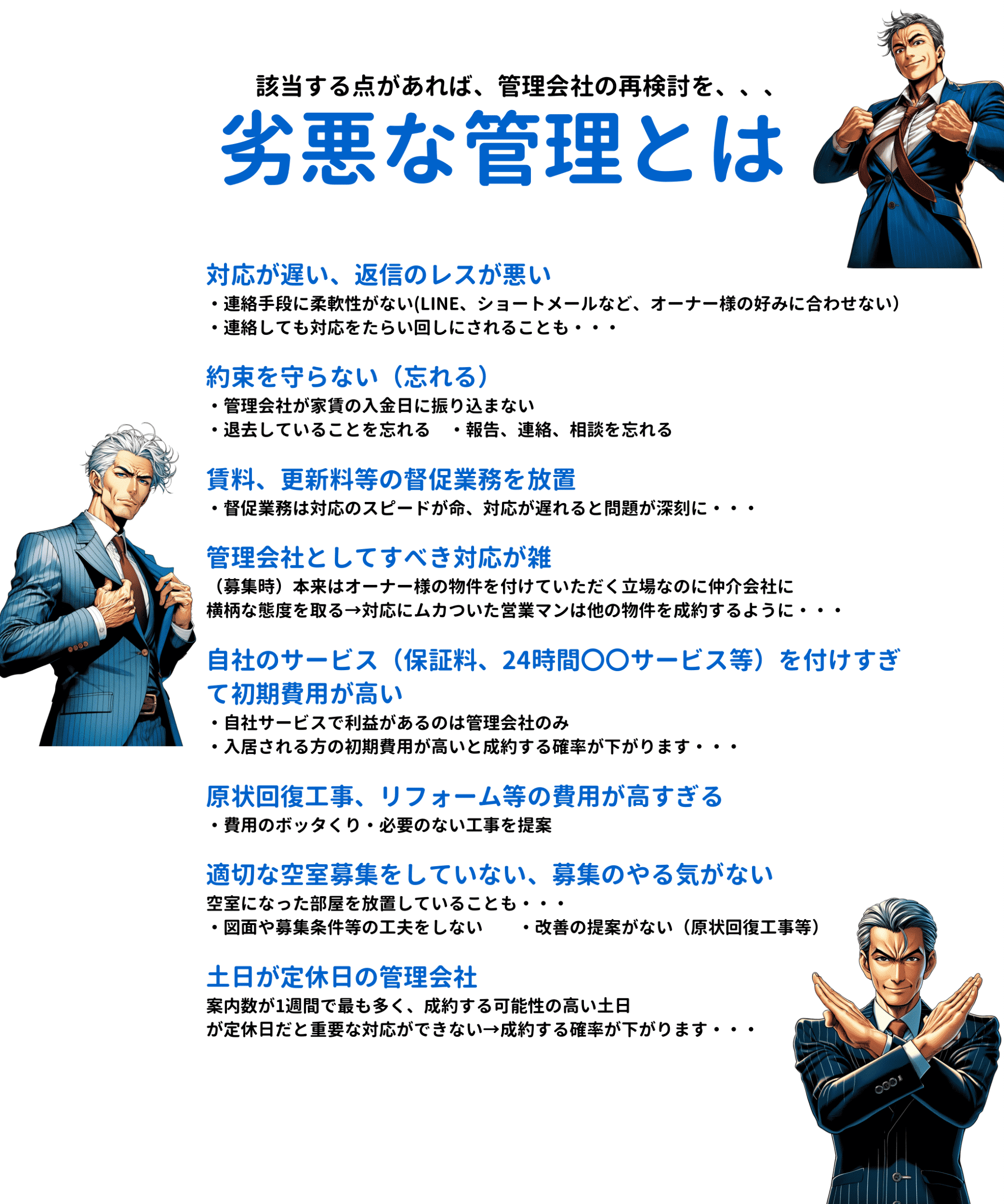 管理会社には、営業で活躍できなかった者や営業が苦手な者が管理部に配属されることが多いです。オーナー様からの相談を通じて検証した結果、この配属方針が「オーナー様が不満に感じる管理会社の共通点」であることがわかりました。