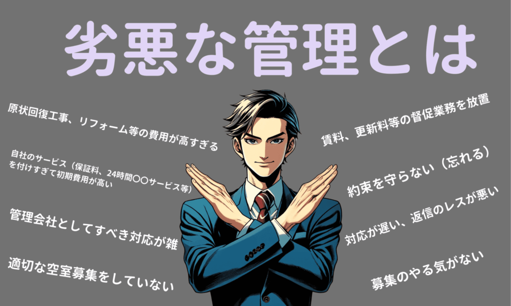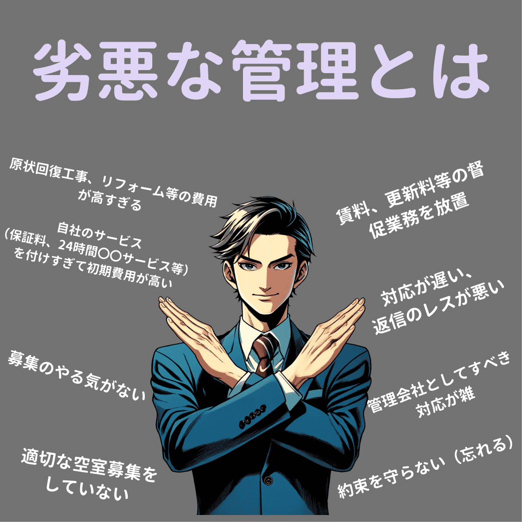 劣悪な管理とは、オーナー様の考えや利益を無視し、自社の利益のみを追求する利己的な管理のことを指します。